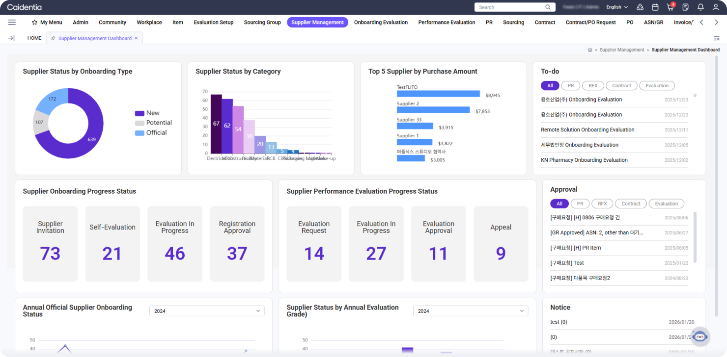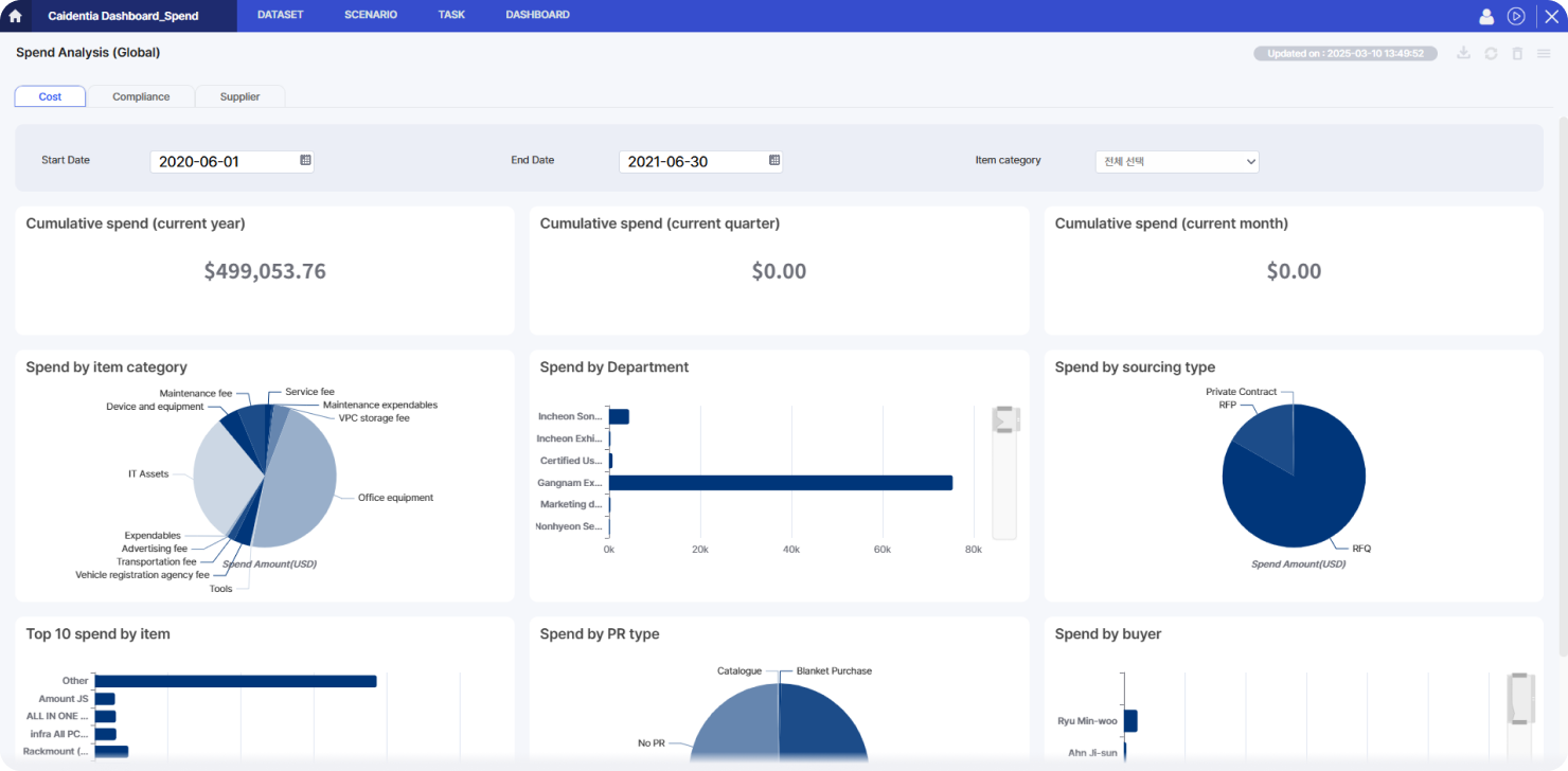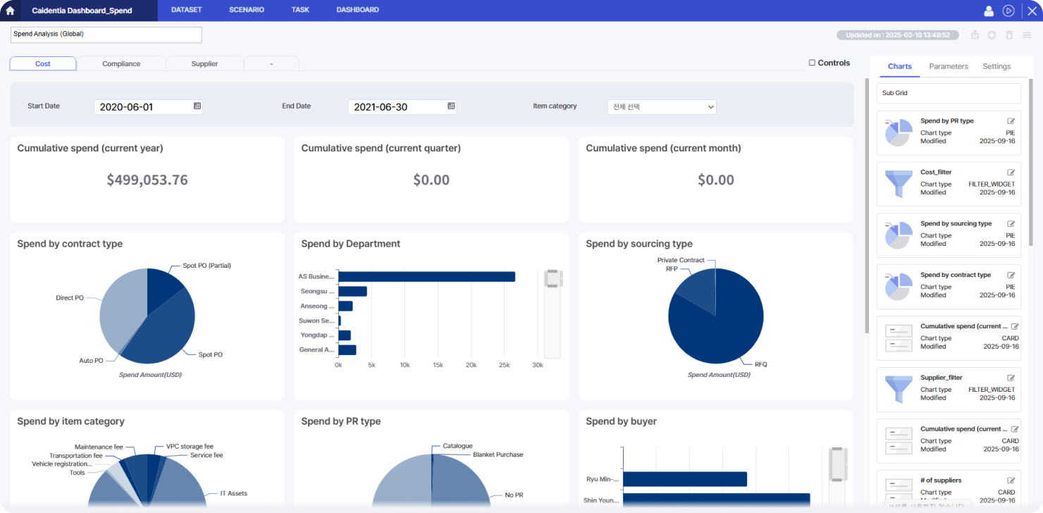 - Spend analysis, supplier status, sourcing status, contract status, compliance status, etc.