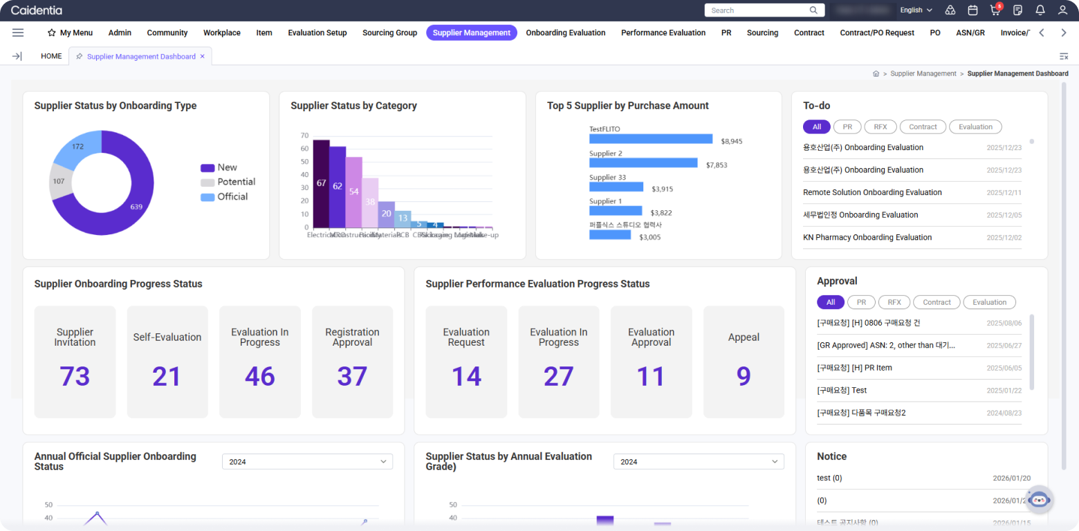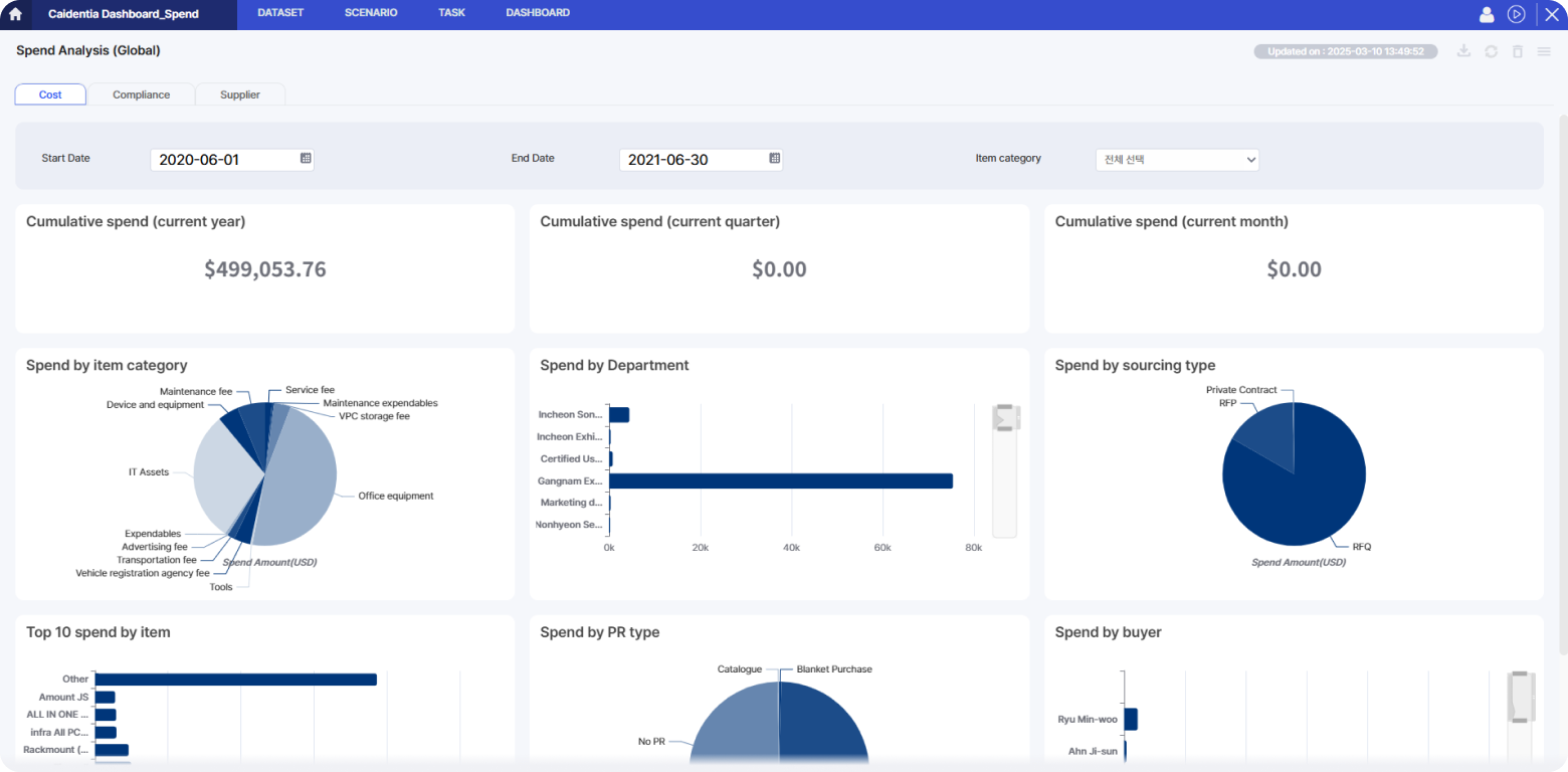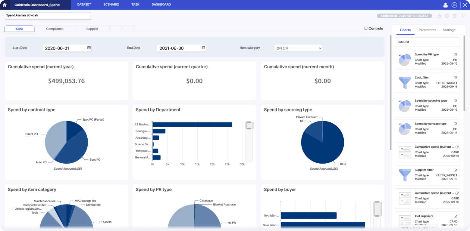- 지출분석, 공급사 현황, 소싱 현황, 계약 현황, 규정준수 현황 등